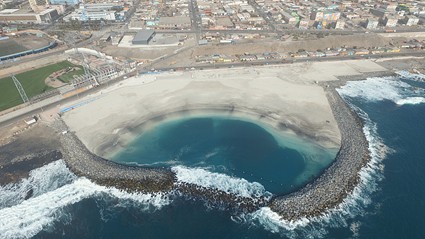 A praia El Salitre, no Chile, apresentava areia escura e contaminada devido às operações portuárias com carvão mineral. O projeto de revitalização encapsulou 29.000 m³ de areia contaminada nos tubos geotêxteis SoilTain CP, criando núcleos estruturais para dois molhes de proteção costeira. A reposição de areia branca limpa transformou a área em espaço de lazer seguro para 27.000 habitantes, valorizando a região e impulsionando o crescimento econômico local.