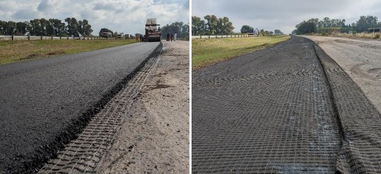 Na província de Buenos Aires, Argentina, a restauração de mais de 65 km da Ruta Provincial nº 6 enfrentava o desafio de controle das trincas de reflexão, comuns em recapeamentos convencionais. A solução adotada foi o reforço asfáltico com HaTelit®, geogrelhas de poliéster de alto módulo recobertas por betume especial, garantindo excelente aderência entre camadas de capa e resistência a danos durante a instalação. Incorporadas ao pavimento, absorvem tensões e retardam significativamente o reaparecimento de trincas. Os resultados incluíram maior durabilidade do pavimento, intervalos de manutenção mais longos, redução de custos e menor emissão de CO₂ durante a obra.