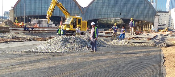 Na renovação do pátio ferroviário da Estação Retiro, na Argentina, o desafio era manter o serviço ativo durante as obras e melhorar a capacidade portante do solo. A solução foi a utilização das geogrelhas biaxiais de polipropileno Basetrac® Grid, que permitiram reduzir a espessura da base do pavimento de 40 cm para apenas 20 cm. Essa otimização viabilizou o uso de lastro reciclado, diminuindo emissões de carbono e melhorando a absorção de vibrações.