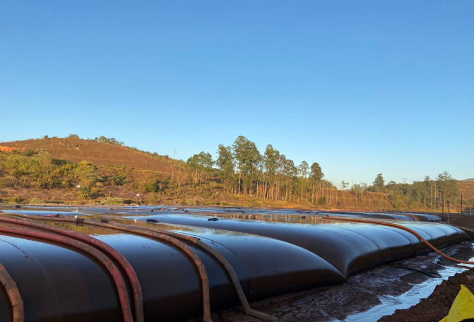 A floculação também é responsável pela grande redução de volume: uma vez que o lodo orgânico floculado é inserido nas geoformas, a atuação do tempo permite atingir os teores de sólidos definidos em projeto – neste caso, 30 %. Assim, o transporte dos sólidos retidos nos tubos é realizado de forma segura para adequada disposição ou reaproveitamento, e a água filtrada retorna ao processo.